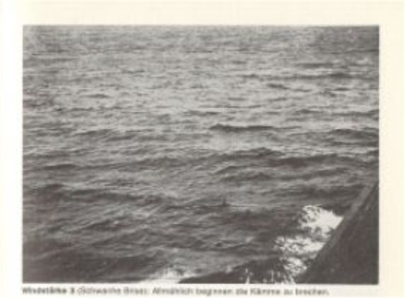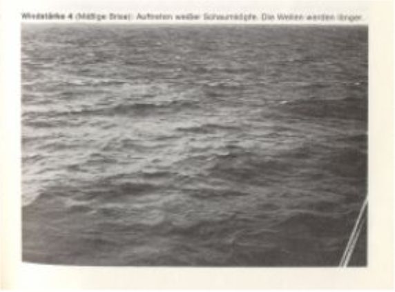 Windstärke 4 ( mässige Brise ) Auftreten weisser Schaumköpfe. Die Wellen werden länger.