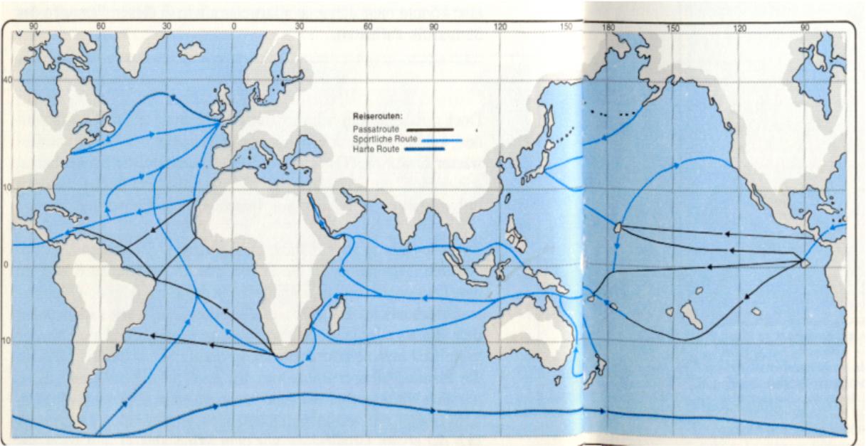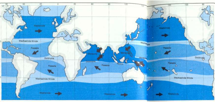 Die grossen Wasserflächen dieser Welt haben ein einigermassen stetiges Windsystem. Sowohl die Passatgürtel als auch die Gebiete westlicher Winde, die Doldrums und Rossbreiten, bewegen sich im Laufe des Jahres nord- oder südwärts. Daraus ergibt sich eindeutig, sie sind jahreszeitlichen Schwankungen unterworfen.Die in dieser Grafik angegebenen Windgebiete können deshalb auch nur annäherungsweise angegeben werden.