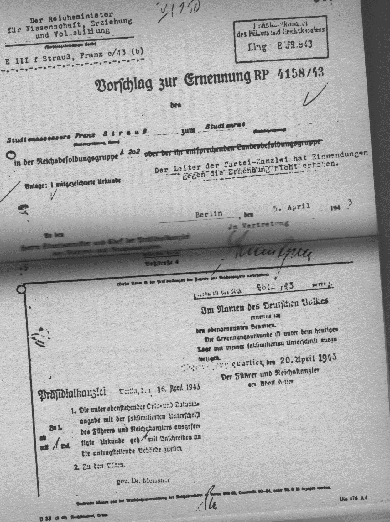 Warum zum Beispiel bestritt Strauss vehement, 1943 zum Studienrat - und damit gleichzeitig zum Beamten auf Lebenszeit - ernannt worden zu sein - [Strauss 1943] - und machte nach dem Krieg noch einmal seinen Studienrat.