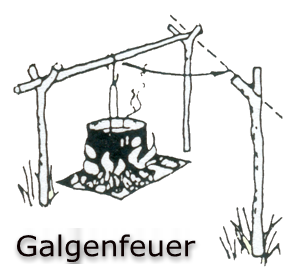 dazu drei Astgabeln im Dreieck. 2 Astgabeln stehen rechts und links neben der Grube, die dritte Astgabel um 90 Grad versetzt. Wenn das Essen im Henkelmann, der an einem quer liegenden Ast über die beiden „Grubenäste“ hängt, fertig ist, dann wird der Ast samt Henkelmann in die um 90 Grad versetzte Gabel gesetzt. Hier kann man nun ganz in Ruhe den Henkelmann vom S-Haken nehmen und in den Deckel des Henkelmanns umfüllen, oder auch direkt aus dem Henkelmann essen.