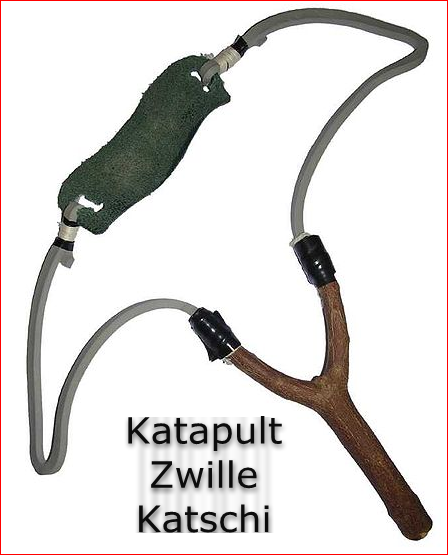 Schleuder – ein längs zusammengefaltetes Tuch oder zwei 40cm lange schnüre, an denen ein Stück Leder oder Gummi eingeknotet wird. Man schleudert die Schleuder so lange über dem Kopf, bis die richtige Geschwindigkeit erreicht ist, dann lässt man ein Ende des Tuches los und der Stein fliegt in die anvisierte Richtung. Verlangt einige Übung.