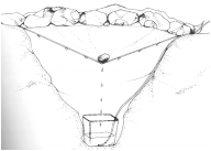 6.) Kloake – möglichst an einem vor Einsicht geschützten Platz anlegen. Hier leistet uns unsere kleine Pflanzschaufel guter Dienste. Je nachdem, wie lange wir an diesem Ort zelten wollen, richten wir die Grösse der Grube ein. Soll es ein längerer Aufenthalt sein, dann schachten wir eine Grube aus, etwa 40 x 40cm und ca. 60cm tief. Bei unseren grossen Geschäften decken wir anschliessend eine dünne Sandschicht drüber. Für diejenigen, die ihr Geschäft nicht in der Hocke verrichten können; zwei starke Astgabeln, die rechts und links vor die Grube eingeschlagen werden. Dazu ein etwa drei Zentimeter starker gerader und glatter Ast, der in die beiden Gabeln gelegt wird. Höhe der Gabeln etwa 50cm. Eine dreiviertel Armlänge vor dieser Konstruktion schlagen wir nun noch zwei kräftige Äste in den Boden. An ihnen können sich nicht ganz so gelenkige Menschen hochziehen, wenn ihr Geschäft erledigt ist.