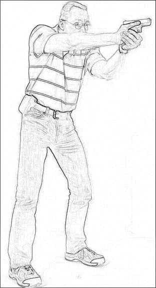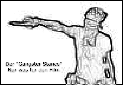 ausgestrecktem Arm bei seitlich gedrehter Hand halten. Das ist Filmklamauk, hat aber mit Combatschiessen nichts zu tun. Es gibt den Anschlag mit ausgestrecktem Arm und seitlicher Körperhaltung, um der gegnerischen Kugel die kleinstmögliche Angriffsfläche zu bieten. So haben sich in grauer Vorzeit „Gentleman“ duelliert. Auch diese Haltung ist nicht optimal, da der Schütze keinen festen Stand hat und durch den Schuss aus der Richtung gedrückt wird. Wertvolle Sekunden, wieder die richtige Position einzunehmen, die das Leben kosten können. Der mexikanische Yaqui- Schuss wird aus der Hüfte aus einer Entfernung von etwa sieben Meter abgefeuert und verlangt sehr viel Übung, Ist deshalb auch nicht empfehlenswert, zumal er nur mit einem Gürtelholster praktiziert werden kann. Die einzige Schusshaltung, bei der es relativ egal ist, welches Holster benutzt wird, ist der Weaver-Schuss. Dabei steht der Schütze in Front zum Gegner, die Knie leicht gebeugt, Füsse in Schulterbreite.